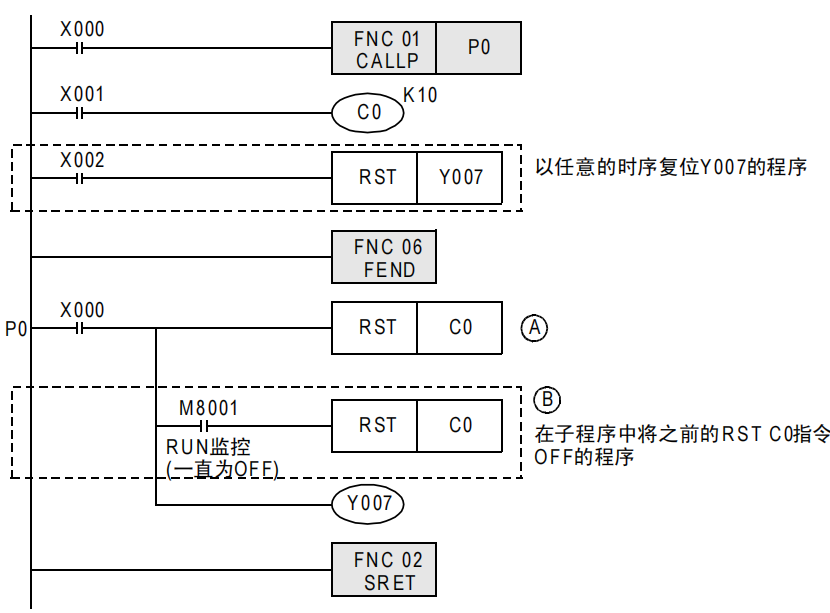 引用引用樓主方奇10010于2021-09-06 21:07發表的 三菱子程序缺陷 :三菱plc調用子程序,子程序里的線圈得電,斷開子程序調用條件,線圈仍然得電,這是三菱的缺陷嗎,使用out指令不就是為了條件斷開就復位,不想復位用set指令不就行了....三菱這個樣子,要在調用子程序的條件后面加一個下降沿復位子程序里的線圈
