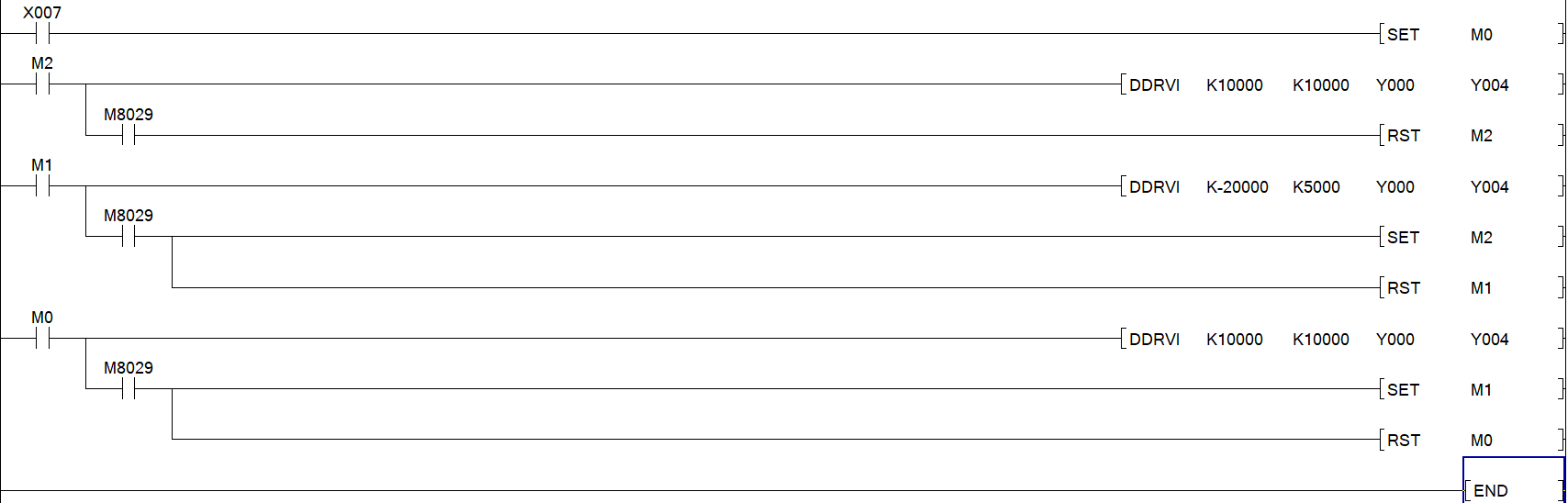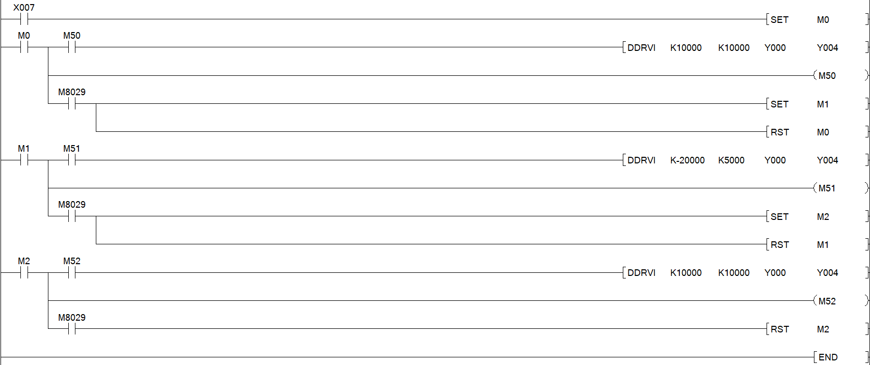 圖1的程序不能正常運(yùn)行,因?yàn)樵谕粋掃描周期內(nèi)不能同時(shí)運(yùn)行多條有相同脈沖輸出口的指令,圖1中,M0后面的定位指令已經(jīng)執(zhí)行,執(zhí)行結(jié)束(發(fā)完1W個脈沖)后M8029立即動作,SET M1后執(zhí)行了下一條定位指令,而M0觸點(diǎn)在下一個周期才會斷開。