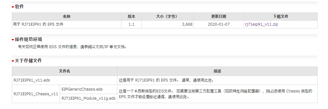 這個中國三菱官方說是QJ71EIP71 沒有EDS文件。然后我取日本官網找了Q系列的確認沒有,然后RJ71EIP91 有EDS,并且有兩個專門適配第三方 像歐姆龍的CHASIS文件。一個是通用EDS,另外一個是RJ71EIP91專用的。不知道這個通用的是否適用QJ71EIP71。圖片是用翻譯軟件翻譯的。