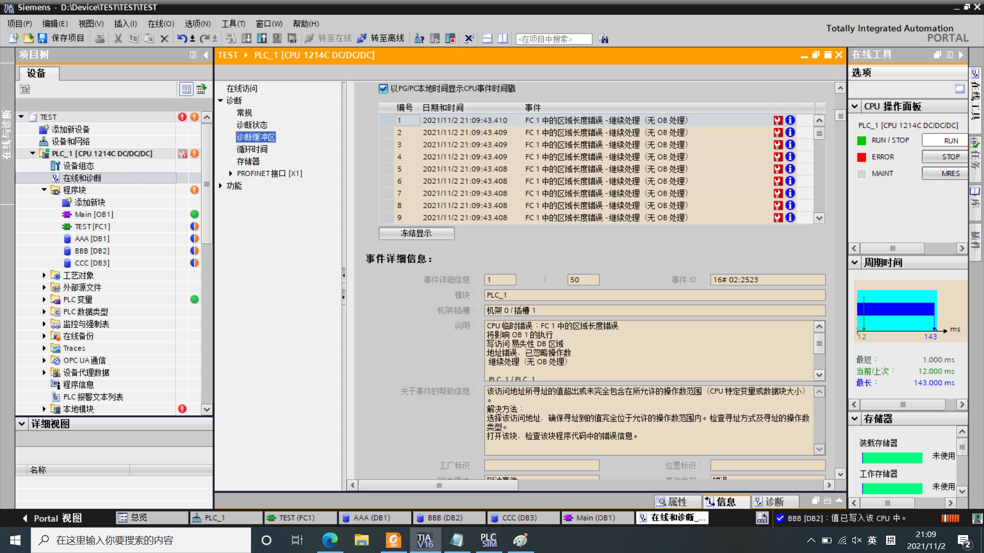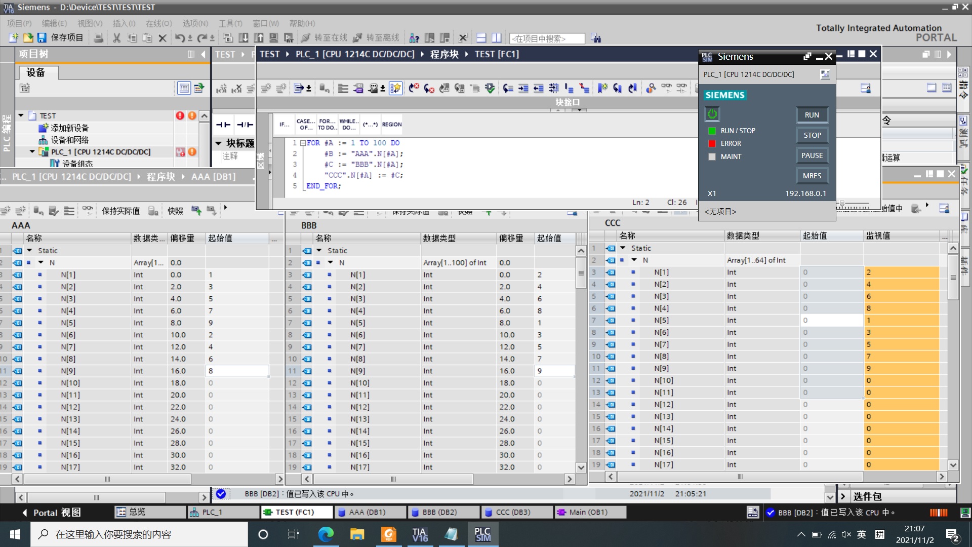 for語句執(zhí)行100次,變量A的值從1到100,所以會出現(xiàn)CCC.N[100].但你組態(tài)的CCC數(shù)據(jù)塊最大只能到64.所以尋址錯誤