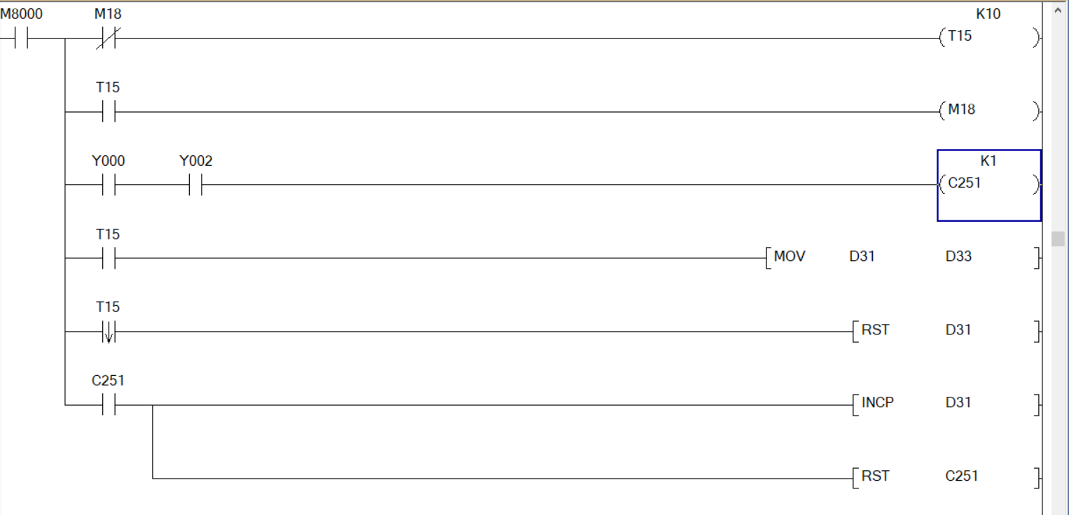 我看你發(fā)的程序,我個(gè)人認(rèn)為,程序設(shè)計(jì)者使用C251意思是:用它來接收X0和X1端的脈沖。當(dāng)X0的脈沖超前X1脈沖90度時(shí),進(jìn)行加計(jì)數(shù),當(dāng)X0脈沖滯后X1脈沖90度時(shí),進(jìn)行減計(jì)數(shù)。當(dāng)計(jì)數(shù)值等于1時(shí),表明X0端和X1端各自輸入了一個(gè)脈沖,兩個(gè)脈沖相差90度,X0端超前X1端90度。然后C251常開觸頭閉合,C251閉合的第一個(gè)掃描周期使D31自加1,然后C251復(fù)位,C251常開觸頭斷開。C251重新從零開始計(jì)數(shù),計(jì)數(shù)值等于1又開始上述動(dòng)作,如此周而復(fù)始。然后把D31轉(zhuǎn)存D33,D33轉(zhuǎn)換成實(shí)數(shù)存D55,D55又經(jīng)過一系列實(shí)數(shù)運(yùn)算,得出的結(jié)果可能是某零件的長(zhǎng)度。那么你說的C251不斷累加計(jì)數(shù),而沒有復(fù)位的這種故障,很有可能是X0端輸入的脈沖不是超前X1端脈沖90度,而是滯后X1端90度,結(jié)果導(dǎo)致C251減計(jì)數(shù),計(jì)數(shù)結(jié)果為負(fù)數(shù),始終不等于1,無法實(shí)現(xiàn)復(fù)位。這個(gè)屬于PLC的X0端和X1端接編碼器的故障 ,不是PLC的故障。還有一種可能,就是這樣編程使用C251有個(gè)前提條件:X0和X1端輸入的脈沖周期不能小于PLC的掃描周期,否則會(huì)導(dǎo)致C251不斷累加計(jì)數(shù)而不會(huì)復(fù)位。另外,需要指出的是,你開始只拿部分程序出來,而不說明PLC的X0和X1端接的什么,別人也很難作出判斷。