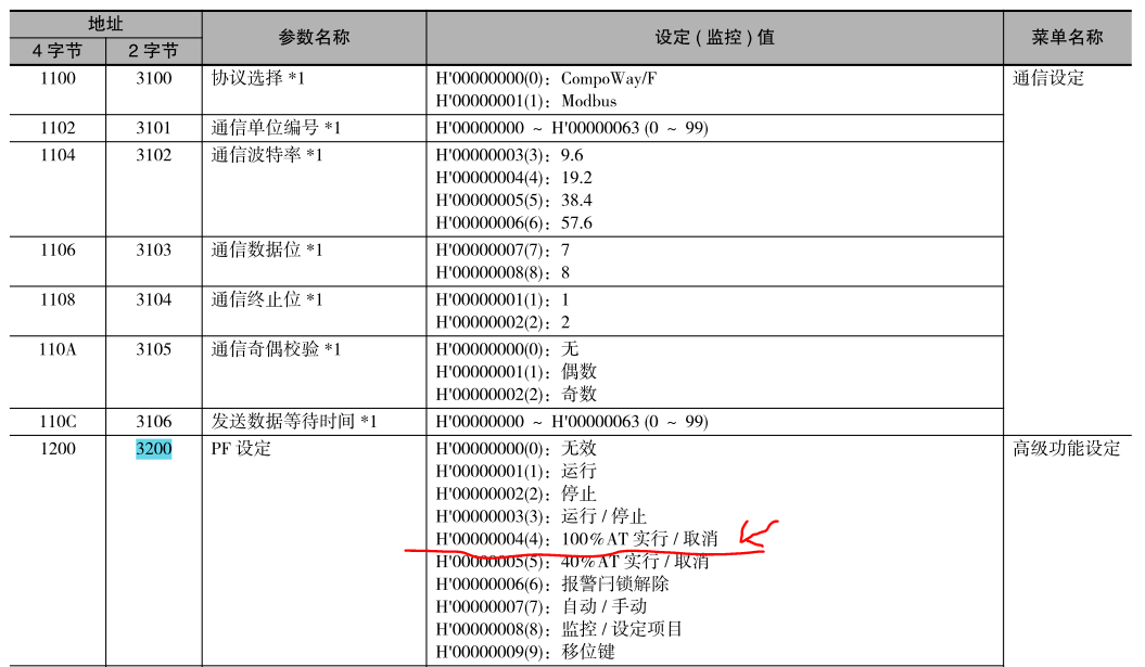 使用Modbus通訊,開啟 E5CC 的AT功能,位置是3200?