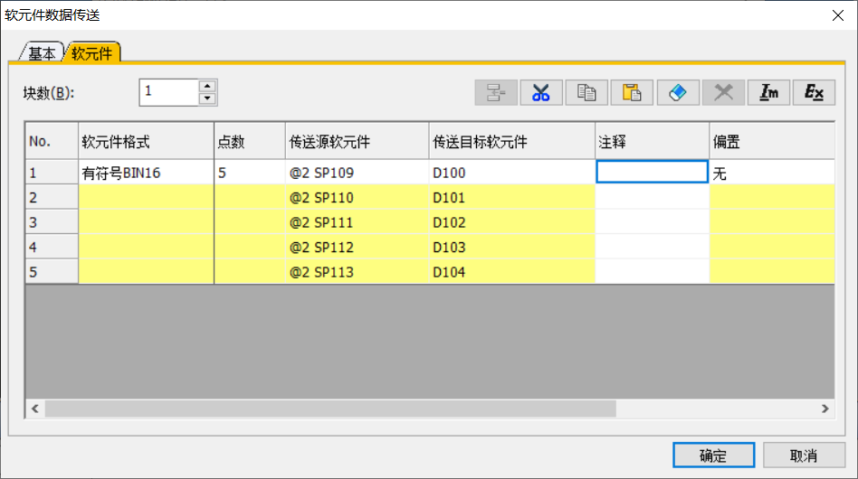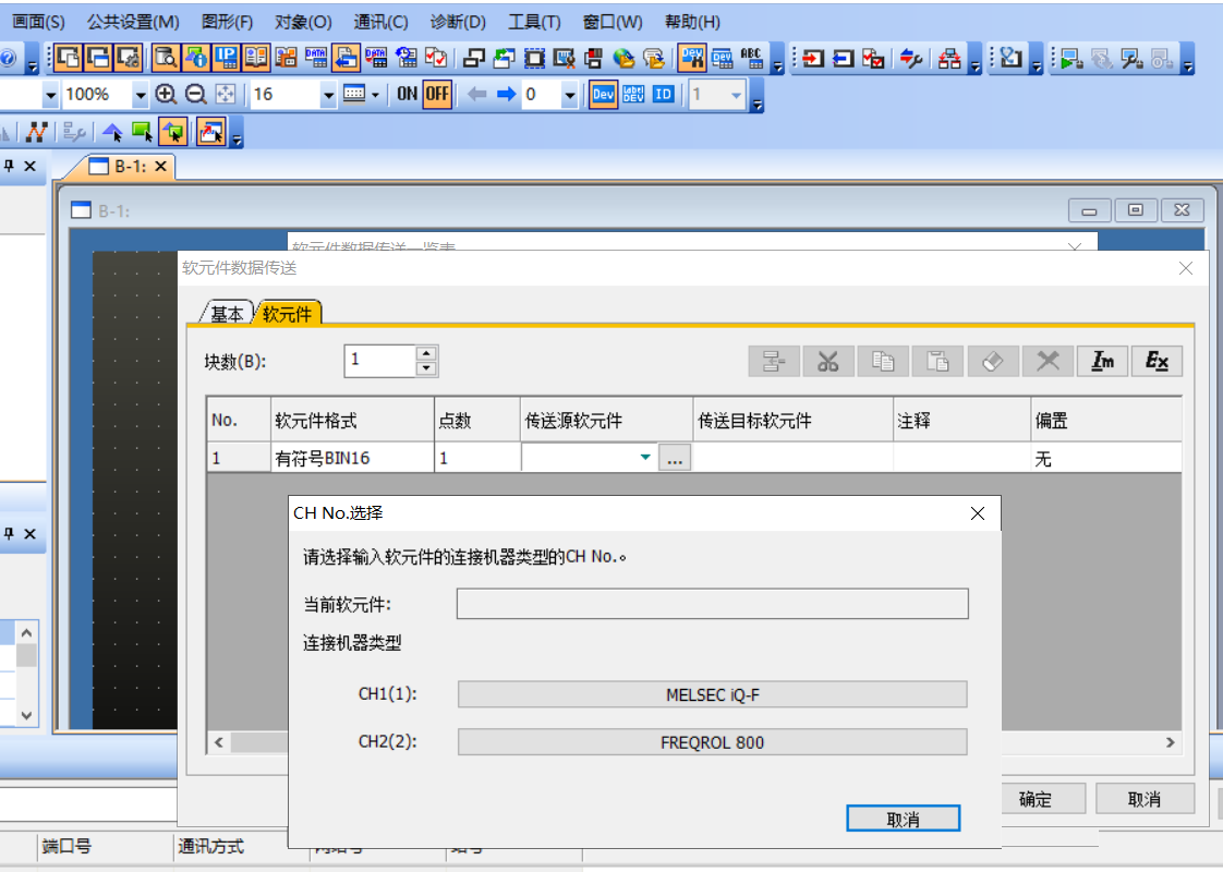 點軟件頂上的“公共設置”,選擇“軟元件數據傳送” 比如你的PLC CH1 PLC CH2 是變頻器,可以設置之間進行數據傳送,可以單點也可以多點 |