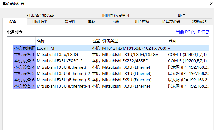 我一臺威綸MT8150IE連接了6臺PLC ![]() 其中4臺是通過交換機用網線連接的 請注意PLC以太網參數設置里面選擇MC協議然后設定端口號與觸摸屏端口號對應即可 |