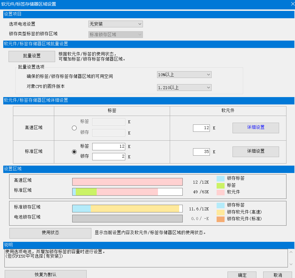 應該是   把標準區域的鎖存容量從2k改大   或者把高速鎖存改小    反正FX5U 鎖存總容量不得超過12k  參考附件圖3