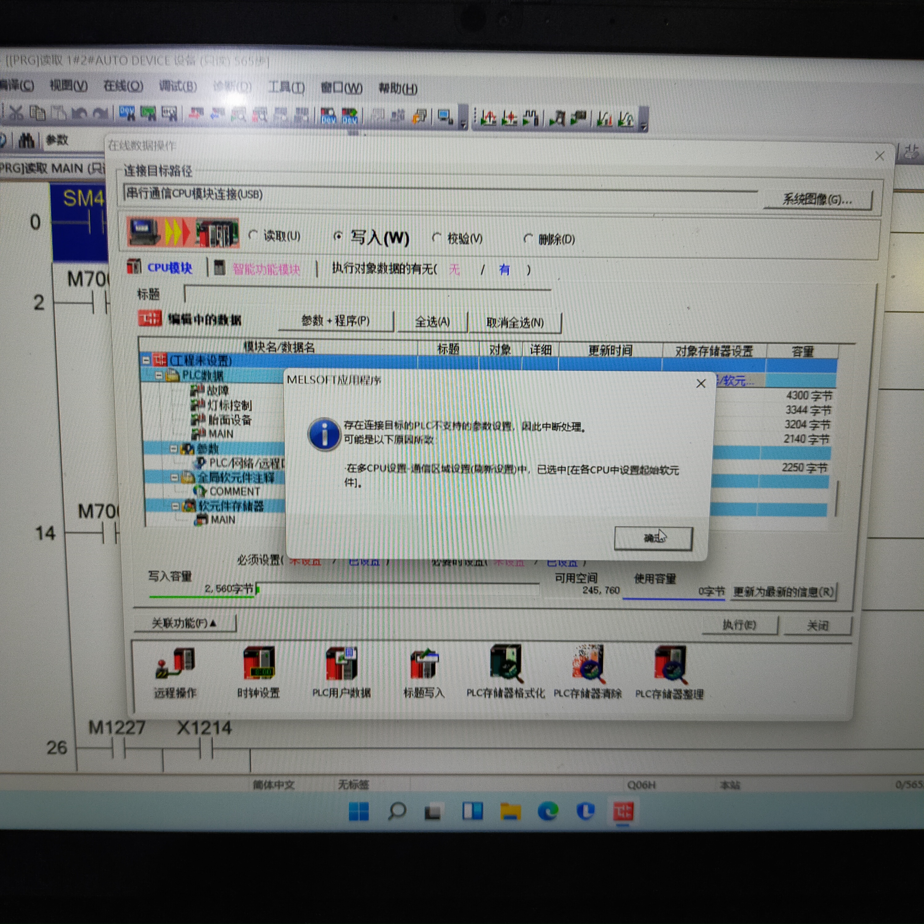 Q06Hcpu壞了采購新的換上后上傳程序彈窗提示,存在連接目標不支持的參數設置,因此中斷處理,可能是以下原因所致,在多CPU設置通訊區域設置中,已選中在各CPU中設置起始軟元件,