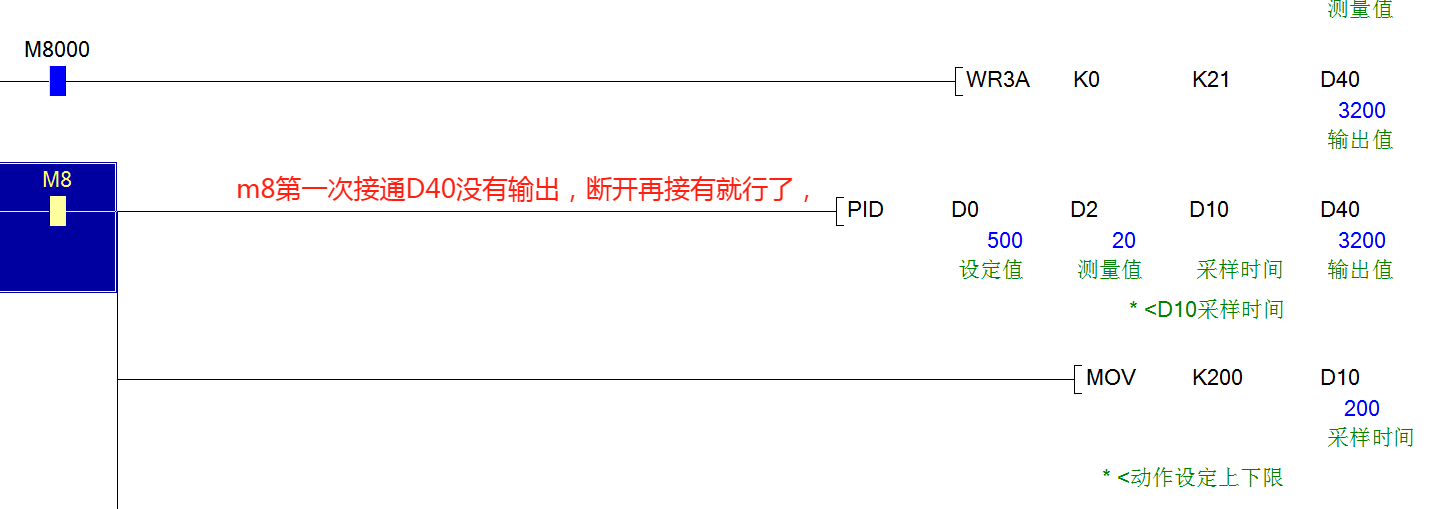 PID指令每次第一次接通無輸出(或PLC每次上電),把M8接通斷開后再接以后就正常了,怎么回事,用M8000做接通指令也是正常