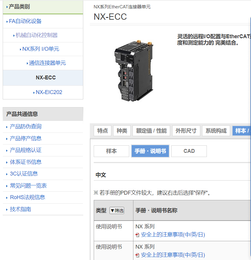 ECT耦合器的手冊只有英文,NX /NJ的軟件手冊、硬件手冊、指令手冊、運動控制手冊都有中文,其他的故障手冊、ECT手冊、EIP手冊都是英文。