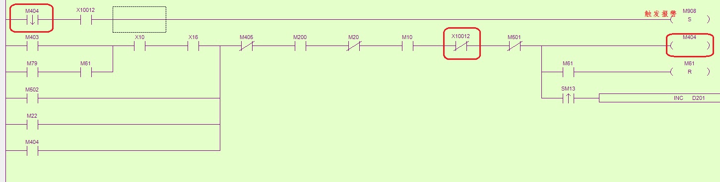 X10012還是正常的(OFF),M404為ON,因為輸入輸出映像刷新是在程序掃描的最前頭的,所以,當要到下一個周期掃描的前端,刷新輸入點,這時X10012變為ON,那么因為上個掃描周期中保存的M404還是為ON,所以,這時是可以觸發M908為ON的,理論分析是這樣的,但是實際上是不行的,用