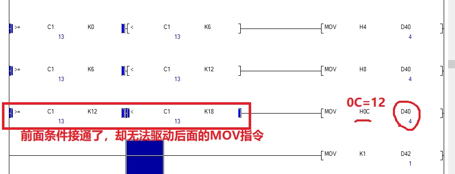 各位大神,我用FX3U PLC做比較時,2個串聯的比較,顯示接通了,但是卻驅動不了后面的MOV指令,這是什么情況啊?