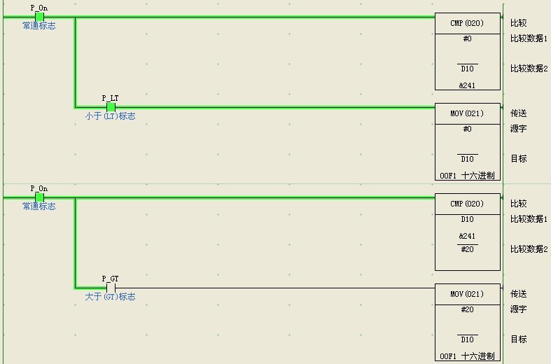 D或者DM數據區,[不同的系列數據存儲區的標注方法不一樣],本來就是斷電保持的。你可以用比較指令來做的,你沒有說明你的PLC系列型號,我就用常用的CJ1M來編寫例子程序了,你可以作為參考: