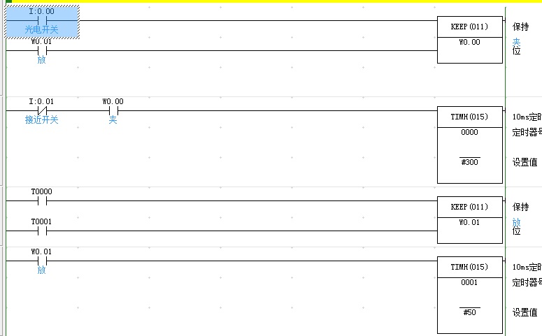 光電開關感應到物件到位,夾盤就開始夾該物件,但如果接近開關未在3秒內感應到夾盤到位的話,夾盤就返回原位,重新再夾。