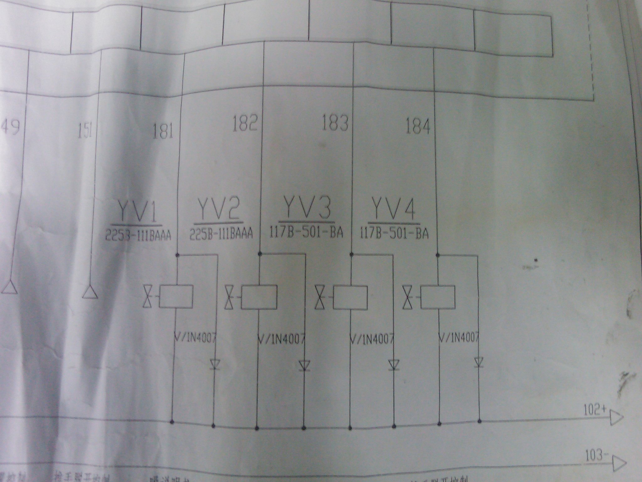 下面圖紙上那幾個電磁閥YV1到YV4,公共端接著一個+24V電壓,另一端接著181到184,再經過一個二極管連接到+24V上,請問這個二極管起什么作用,還有181到184端是什么電壓的時候電磁開始工作。