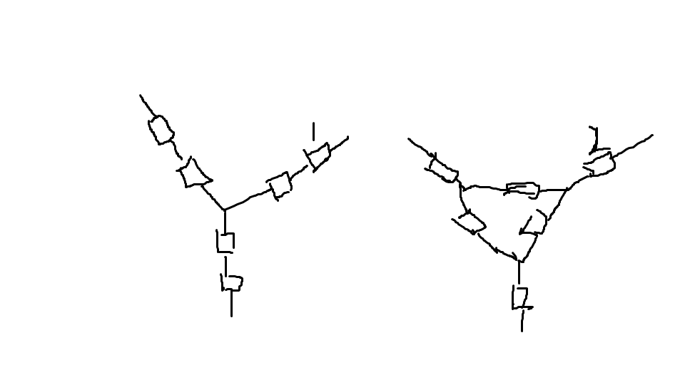 圖2中間的三角形的三個電阻,可以等效轉換成星形接法(但電阻值要計算),這樣就能轉換成圖1形式的接線圖。