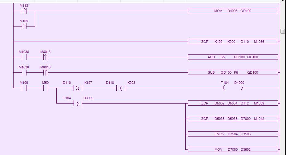 這三段程序都是同一程序的一部分且能正常運行,Qd100是變頻器,D110是壓力傳感器,D3504和D7000分別是瞬時流量和脈沖;問題是三段程序都把流量和脈沖mov到同一個地址D3506和D3502上,而在力控上顯示時又分別在不同的位置,求教是怎樣做到的?