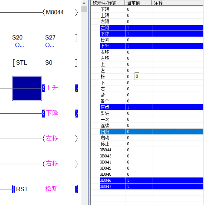 如圖,這是我復(fù)制了編程手冊上的ist程序舉例在軟件上做的模擬,先驅(qū)動自動模式,在自動模式運行過程中直接把模式切換到原點回歸模式,再按下原點回歸,此時執(zhí)行原點回歸動作(上升),與自動模式的動作(下降)產(chǎn)生了沖突。