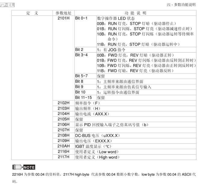 臺達變頻器參數(shù)定義正轉反轉我看明白了  讀出的 2102H到2117H不明白      在程序里我是不是直接 H2117轉換成 ASCI 發(fā)給變頻器嗎 是不是這樣