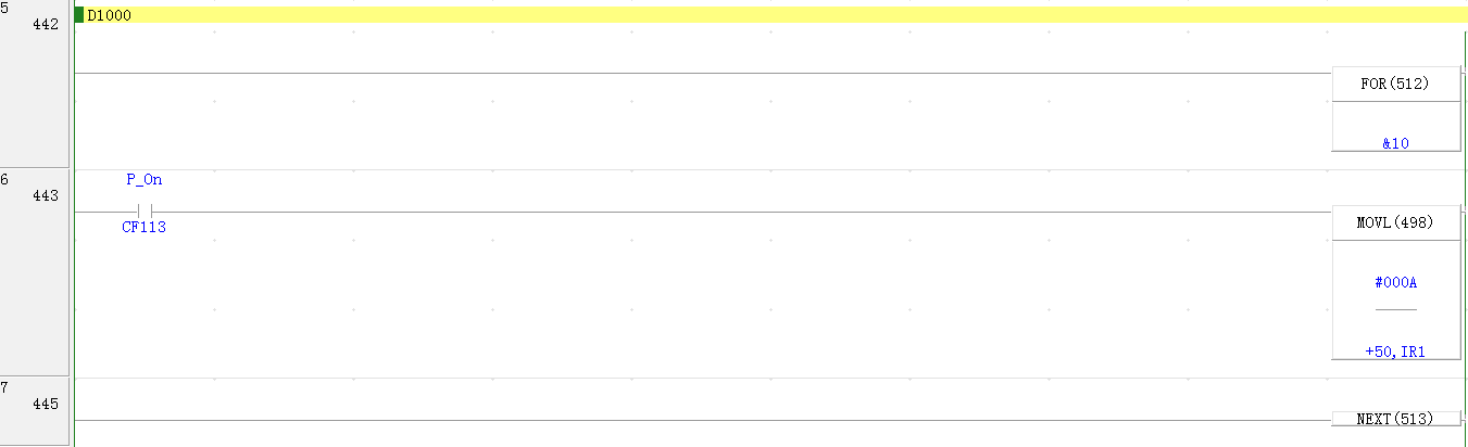我想用IR1間接給D1000,D1050.....,D1500賦值#000A,可是運(yùn)行發(fā)現(xiàn)只有D1050賦值了,其他都沒(méi)變,所以請(qǐng)教一下,我該怎么改程序,使IR1每次循環(huán)都增加50。