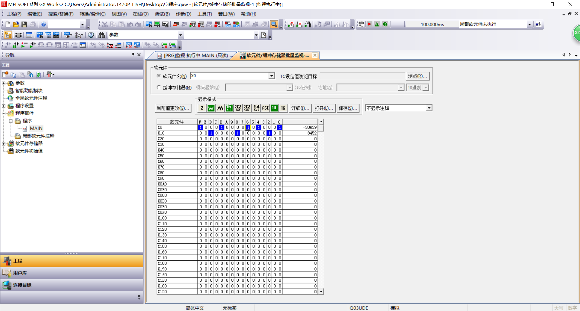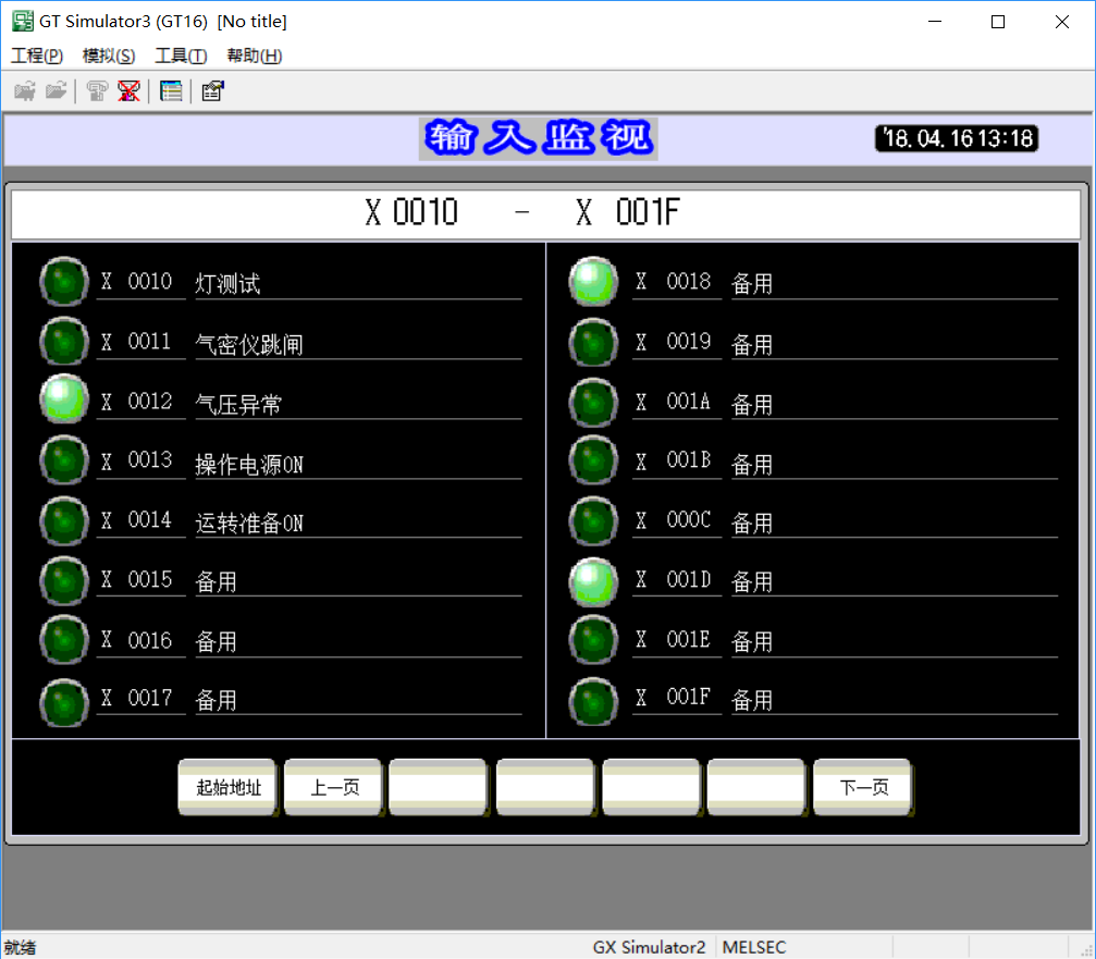 PLC為空程序,只是用來啟動模擬和賦值。GOT顯示X00-X0F,點下一頁,顯示X10-X1F。