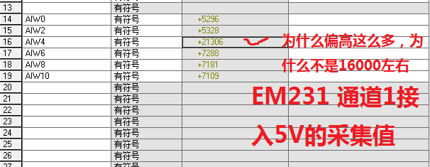 2. 同樣的方法,把5V接入到EM231的通道上,數字值到了20000多,證明轉換有問題?這是模塊壞了嗎?接入0V后,采集數字值還是7000多。我已經把負端和電源短接了,但是沒有效果,大家看,這是怎么回事?