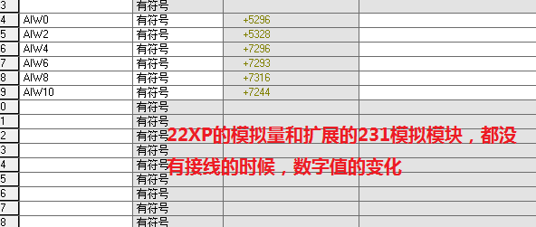 一個CPU224XP的主機,帶著一個EM231的4路模擬量擴展模塊,端子什么也沒有接,監控AIW數據區怎么會有這么高的數值變化呢?224xp本機的2路模擬量不接線都顯示5000左右的數字值。EM231的模塊不接線,監控顯示7000多的數字值變化,這是怎么回事?
