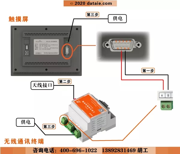 第三步:全部接線結束后,分別給觸摸屏與無線通訊終端供電