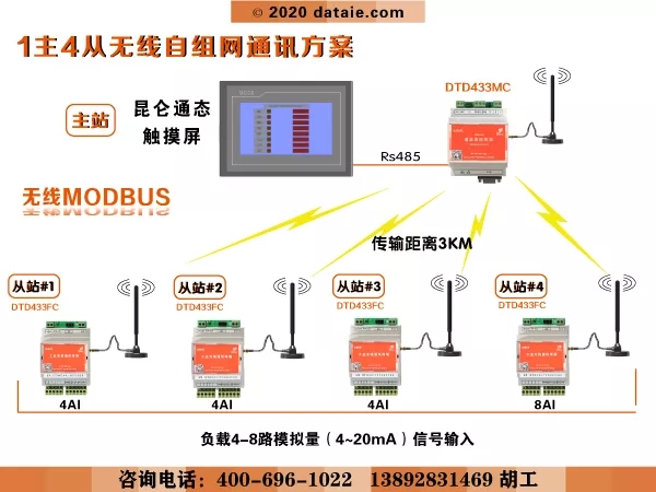 本方案是昆侖通態觸摸屏4DTD433FC無線模擬量信號測試終端進行無線 Modbus 通信的實現方法。方案中昆侖通態觸摸屏作為主站顯示各從站的模擬量信號,傳感器、DCSPLC、智能儀表等4個設備作為Modbus從站輸出模擬量信號。方案中采用達泰電子無線模擬量信號測控終端——DTD433FC與達泰電子無線通信數據終端——DTD433MC,作為實現無線通訊的硬件設備