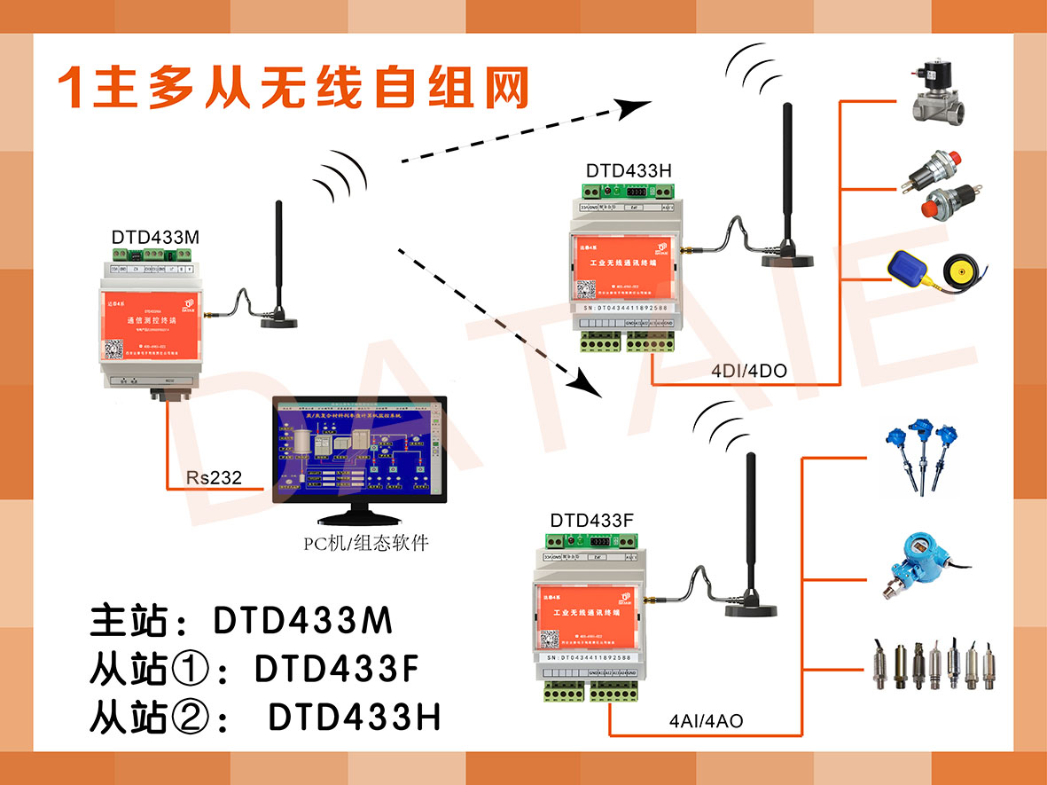 多點集群自組網通訊必須有一個主機(主站),主機型號為DTD433MDTD434MDTD435M無線通訊終端,才能與從機進行自組網無線通訊。從機(從站)可以采集開關量、模擬量信號,型號為DTD433HDTD433F。一臺主機可與256個從機配套使用。所有從機的地址都是唯一的,不會存在從機間互相干擾的情況。