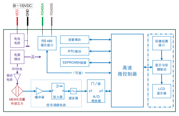 該流量計同時實現(xiàn)熱源的產(chǎn)生與溫度的測量。當(dāng)芯片處于工作狀態(tài)時,在傳感器的周邊形成穩(wěn)定的溫度場分布。一旦一定質(zhì)量的氣體流過傳感器時,氣體的流動將破壞該溫度場的分布,形成特定的、取決于該氣體的質(zhì)量和速度的溫度場分布。微機(jī)電系統(tǒng)流量計芯片上的傳感器將測量這一變化并把這一變化轉(zhuǎn)換為電信號,由一個專門的電路變送器對此信號進(jìn)行放大、調(diào)理并作線性化處理。由于不同質(zhì)量的氣體對傳感器的周邊形成穩(wěn)定的溫度場分布所產(chǎn)生的擾動不同,因而能測量氣體的質(zhì)量流量或總流量。下圖為該系列流量計的原理框圖。