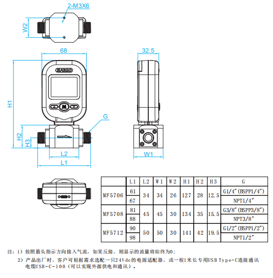 美國Siargo便攜式氣體質(zhì)量流量計MF5700系列產(chǎn)品結(jié)構(gòu)與機(jī)械尺寸: