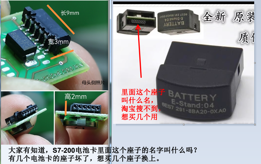 因為手里十幾個S7-200電池卡,座子都壞了,扔掉了可惜,想買座子回來修起它們來,但是問了很多商家也沒有賣的,大家有知道,這個東西哪里有賣的嗎,或是關鍵詞叫什么?我查下,謝謝大家