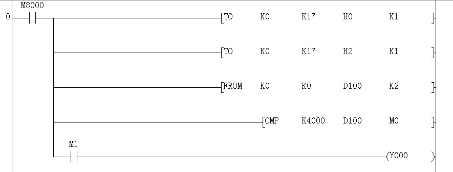 剛開始學FX2N-2AD模塊的使用,自己寫了一個程序,請大家?guī)兔﹁b定一下對嗎?程序意思就是說,現(xiàn)在模塊CH1通道接著一個溫度傳感器,傳感器的測溫范圍是0-100度,輸出0-10V電壓給模塊,對應(yīng)模塊內(nèi)部的數(shù)字變化是0-4000,那么我編的這段程序,當現(xiàn)場溫度到100度時,Y0會輸出嗎?這樣寫可以嗎?