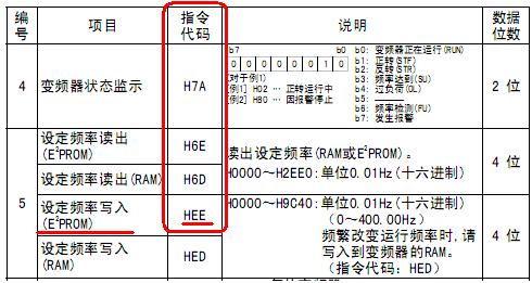 D700的HEE代碼應該是指將頻率同時寫入E2PROM和RAM,那么可以理解為D442中的數據就是要求的變頻器頻率。