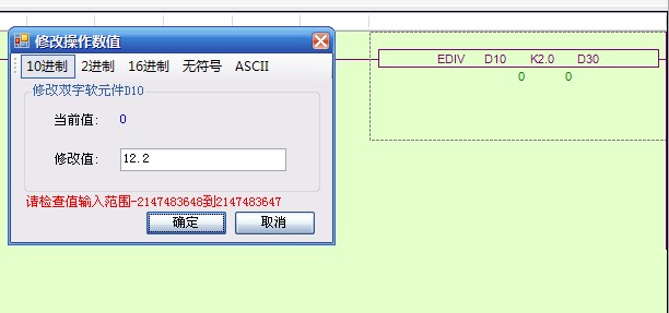 我現在用文本顯示器輸入帶小數的值12.2,給D10,為什么提示不能輸入呢?信捷的PLC在運算小數相乘或是相除時,該怎么寫程序。