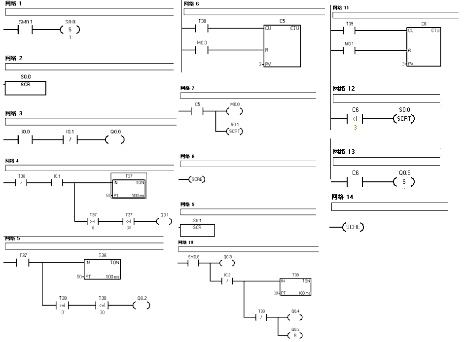 這個程序我想實現:Q0.1和Q0.2亮3次后,進入S0.1,若C6小于3則再跳入S0.0,若C6=3則Q0.5亮。但是我在運行PLC的時候,Q0.1和Q0.2不停地亮,Q0.5不會亮,甚至C6都不計數,如果把網絡12去掉,網絡13改成C6==1反而Q0.5能亮,跪求大俠指導這是什么原因